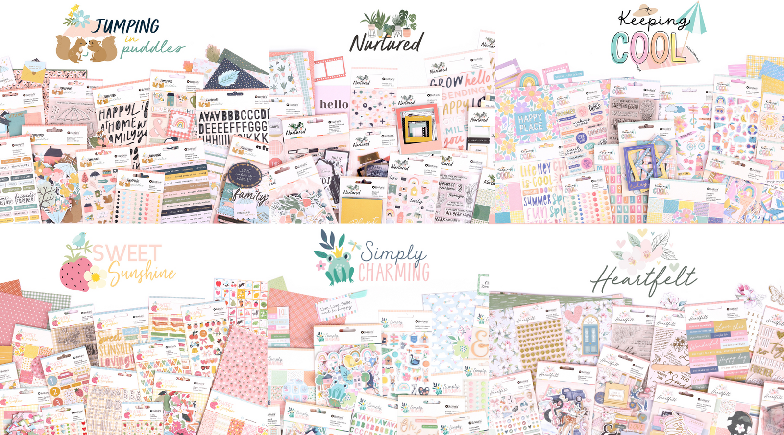 Each of their collections is designed in New Zealand by their in-house designers and features coordinated 6×6” and 12×12” papers, diecut ephemera, clear stamps, stickers and lots of great embellishments.